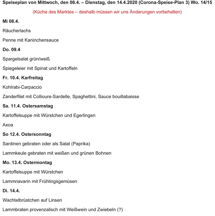 Wenn Sie es geschickt anstellen und die Gerichte aufeinander abstimmen, dann ergibt der Tafelspitz am Sonntag die Brühe für die Kartoffelsuppe am Montag und den Rindfleischsalat am Dienstag. Oder der Spargel mit Butter und Schinken ergibt am nächsten Tag einen Spargelsalat als Vorspeise und eine Spargelcremesuppe am Tag darauf. Das ist das eine, wichtiger ist jedoch, dass der Einkaufszettel alles enthält, was man für den Planungszeitraum braucht. Je weniger oft man einkaufen muss, desto geringer das Risiko.