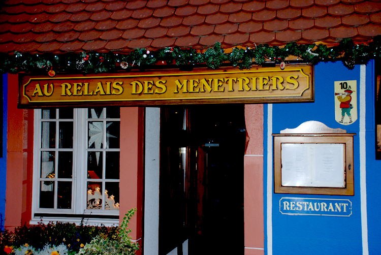 Etwas außerhalb vom Zentrum Ribeauvillés, aber von dort leicht zu Fuß zu erreichen, liegt das Viertel der Dorfmusikanten (Ménétriers). Dort gibt es ein sehr empfehlenswertes Restaurant: Relais des Ménétriers. Sehr gutes Essen mit interessanten Gerichten zu einem akzeptablen Preis und sehr freundlicher Bedienung. Unweit vom Restaurant liegt das Hotel Les Ménestrels, in dem man sehr gut wohnen kann. Auch wenn der Verkehr nachts nicht sehr stark ist, sollten Sie darauf achten, dass Sie ein Zimmer nach hinten in die Weinberge oder zur Seite bekommen.