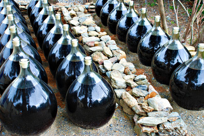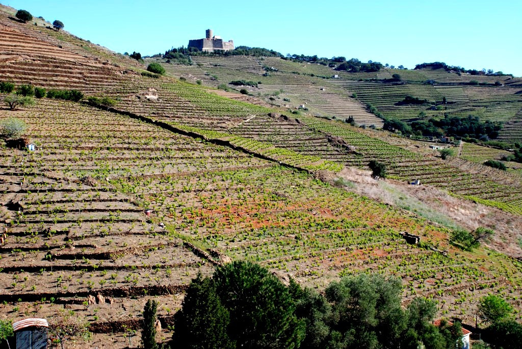 2. Die Hänge um Collioure gehören zum Weinanbaugebiet Banyuls. Die Weinstöcke wachsen auf den dunklen, steilen, schiefrigen Abhängen der Pyrenäen und reichen bis ans Meer. Traditionell wird bei diesen Weinen die Gärung mit Weingeist gestoppt und sie werden in sogenannten Bonbonnes - große, meist 25 Liter fassende, bauchige Glasflaschen - über eine längere Zeit (1-4 Jahre) im Freien der Sonne ausgesetzt. Anschließend läßt man sie in Holzfässern bis zu 20 Jahre weiter reifen. Die Methode, die sonst nur noch bei den Süßweinen von Maury angewendet wird, führt zu mehr oder weniger braunen Weinen, mit sehr viel Aroma (Schokolade, Mokka), mit Restsüße sowie dem typischen, dem Alterungsprozess zu verdankenden, Rancio-Geschmack. Sie gehören zu den wenigen Weinen, die zu Schokoladendesserts passen. Ähnlich wie bei den Vintage-Portweinen gibt es jedoch auch Banyuls-Weine, die bereits jung als Jahrgangsweine abgefüllt werden und dann Flaschenreife brauchen (Rimage). Die Rotweine dieser Zone tragen die AOC "Collioure": Dunkle, schwere Weine hauptsächlich aus