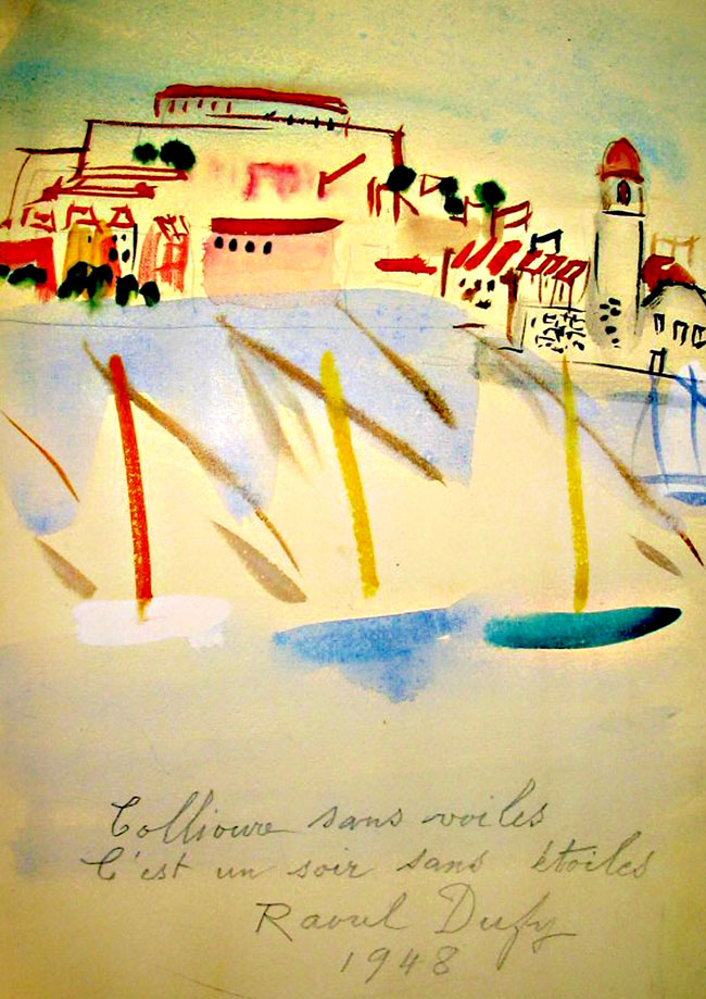 1. Der Bildhauer und Maler Aristide Maillol aus Banyuls - südlich von Collioure - war befreundet mit einer ganzen Reihe von französischen Expressionisten und schwärmte Ihnen vom Licht an seiner "Côte Vermeille" (Messingküste) vor. 1905 verbrachten Henri Matisse und André Derain den Sommer in Collioure. Dies gilt heute als die Geburtsstunde des "Fauvismus". Seit etwa der Jahrtausendwende erinnert der "Fauvismusweg" in Collioure an diese Zeit: An 20 Stellen im alten Teil von Collioure sind Reproduktionen der beiden Maler aufgestellt, die dort entstanden sind. Es entstanden über 270 Bilder. Diesen beiden Malern folgten eine ganze Reihe anderer, später sehr berühmter Maler wie Raoul Dufy, Chagall oder Pablo Picasso. Ein Gemälde von Raoul Dufy trägt groß den Titel "Collioure sans voiles c'est un soir sans etoiles" (Collioure ohne Segel ist wie ein Abend ohne Sterne). Und wer wissen will, wie die damals noch sehr armen Künstler sich über Wasser gehalten haben, der sollte sich einmal die Bildersammlung in der Bar des Hotels Les Templiers anschauen. Auch wenn es sich dabei inzwischen meist um Kopien handelt.
