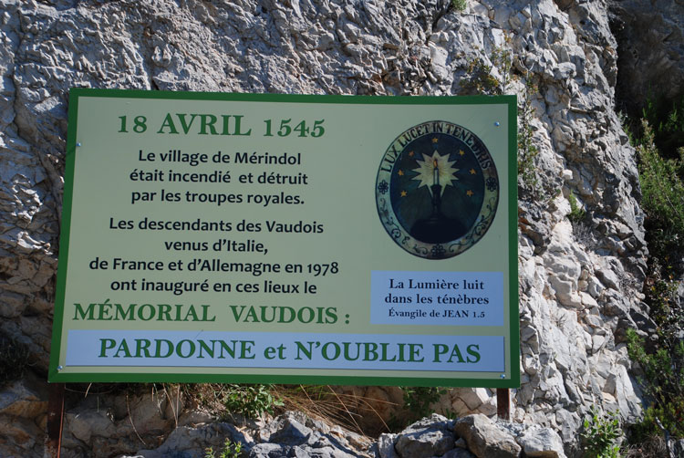 "Vergib aber vergiss nie!" steht auf einer Tafel auf dem Weg hoch zur Schlossruine von Merindol. Sie wurde anlässlich der Eröffnung des Waldenser-Mahnmals 1978 von Nachkommen der umgebrachten Waldenser aus Italien und Deutschland angebracht.