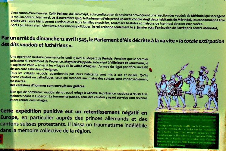 Die grauenhaften Vorgänge in Merindol und einigen anderen Gemeinden, in denen die Waldeser lebten, seien wenigstens kurz dargestellt: Am 1. Januar 1545 forderte der französische König Francois I. das Parlament der Provence schriftlich auf, sein Dekret umzusetzen, in dem er 4 Jahre zuvor angewiesen hatte" es so einzurichten, dass die Provence vollständig entvölkert und gesäubert werde von diesen Verführern". Die Leitung diese Aktion übernahm der Baron d'Oppède, Jean Maynier. Mit vielen Soldaten begann er am 13. April 1945 systematisch mit der Durchsuchung von insgesamt 24 Luberon-Dörfern. Dabei wurden rund 3.000 Frauen, Männer und Kinder gefoltert, vergewaltigt, ermordet oder verschleppt.