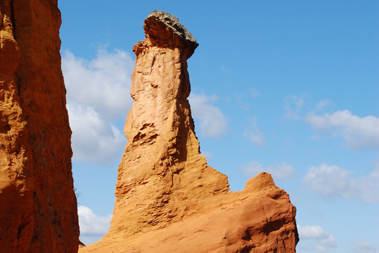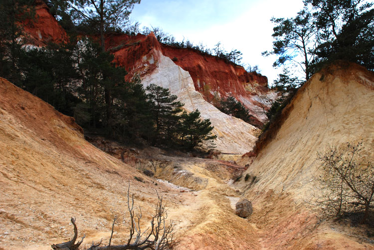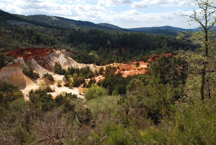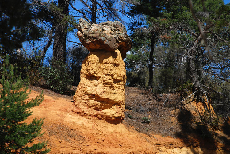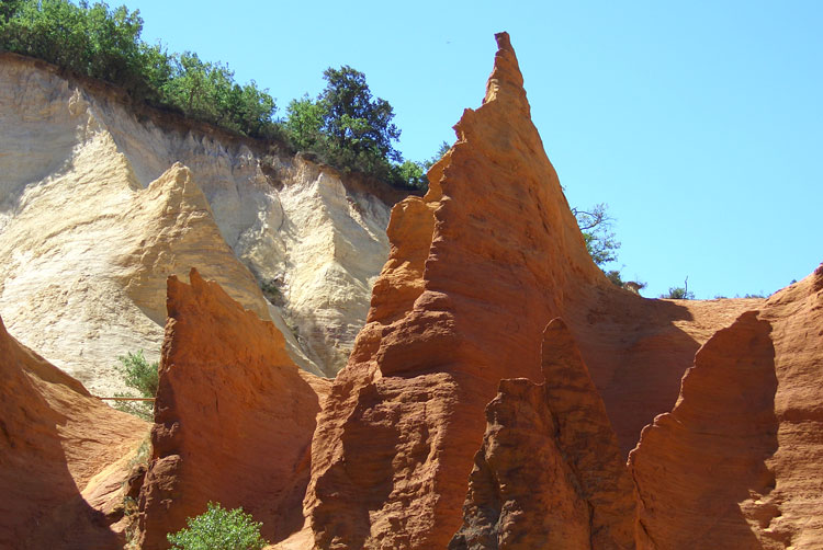 Einzigartig und sehr sehenswert ist der sog. Colorado provençal - ein ehemaliges Ockerabbaugebiet, wo man auch heute noch Wasserzuleitungen, Pumpen, Setzbecken u.ä. sehen kann. Aber insbesondere sind die Ockerfelsen mit ihren bizarren Formen und Farben einen Besuch wert. Inzwischen gibt es mehrere gut gekennzeichnete Routen mit unterschiedlicher Länge, die an die schönsten Stellen führen mit so ausdrucksvollen  Namen wie Cheminées des Fées (Feen-Schornsteine) oder Le Sahara.. Bei unserem letzten Besuch (2016) war allerdings der beeindruckend schöne Bereich der Cheminées des Fées aus Sicherheitsgründen gesperrt. >>>>Video: Locker vom Ocker.