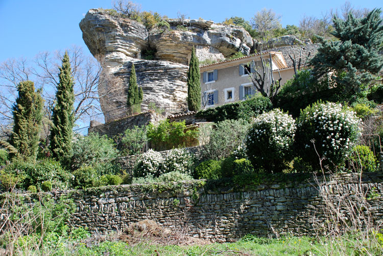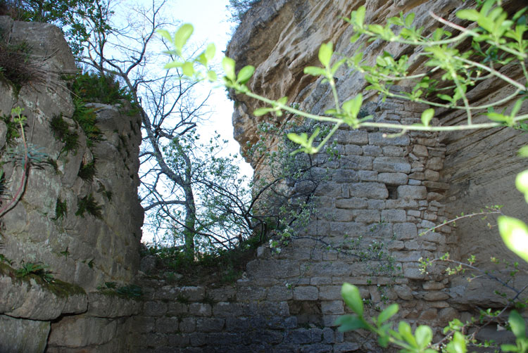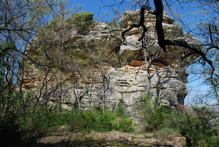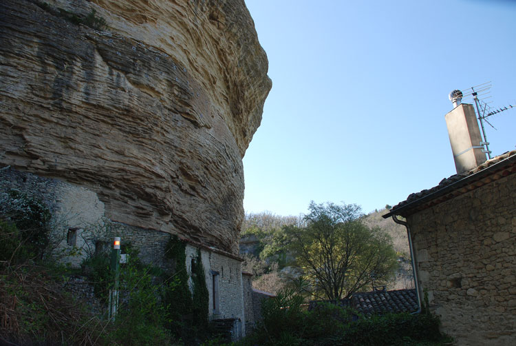 Vom Felsen von Rocsalière führt ein kleiner Weg über einen Bach zum "Rocher des Druides" - dem Druidenfelsen, manchmal auch "Schloss der "Druiden" genannt. Dies ist ein sehr schöner, kurzer Weg, den wir immer wieder gerne gehen - auch für ein kleines pique-nique (den Rosé kann man in La Marguerite, dem kleinen Bach, kühlen). Der Weg kann übrigens in verschiedene Richtungen zu mehr oder weniger langen Wanderungen erweitert werden. Der "Druiden"-Felsen hat etwas Magisches, obwohl er mit Druiden überhaupt nichts am Hut hat. Einige schlechte Frauen (auch Freudenmädchen genannt) wohnten dort und gingen ihrer Tätigkeit nach. Aus dem provenzalischen "lou toumple dei drudas" des Mittelalters (die Höhle der Dirnen) wurde französich "Le rocher des Druides" (der Druidenfelsen). René Bruni, von dem die Geschichte stammt, merkt an "Es ist nur die Übersetzung erhalten geblieben". Was insofern nicht ganz stimmt, weil man durchaus noch die Struktur und Reste der Behausungen und die Befestigungen am Felsen erkennen kann.²
