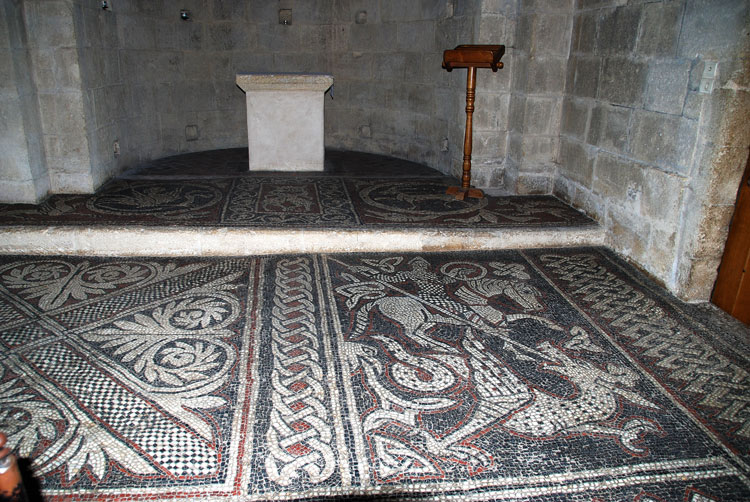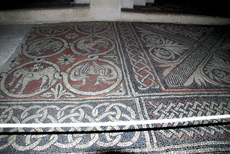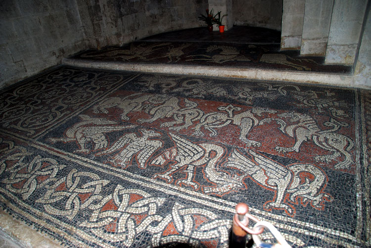 Im Altarraum befinden sich die orientalisch inspirierten Mosaiken aus dem 12. Jahrhundert: Ornamente, Elefanten, ein Greif, ein Centauer und ein Löwe, aber auch zoologisch nicht unmittelbar zuordenbares Getier.