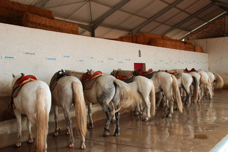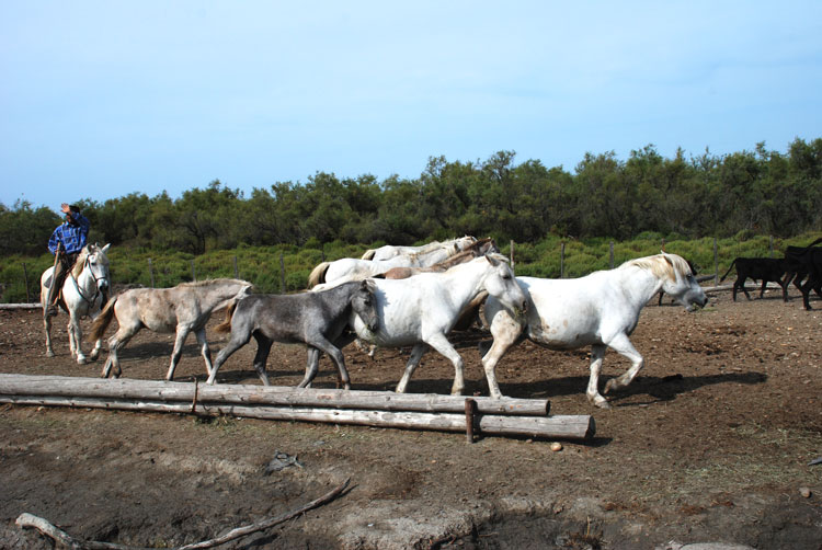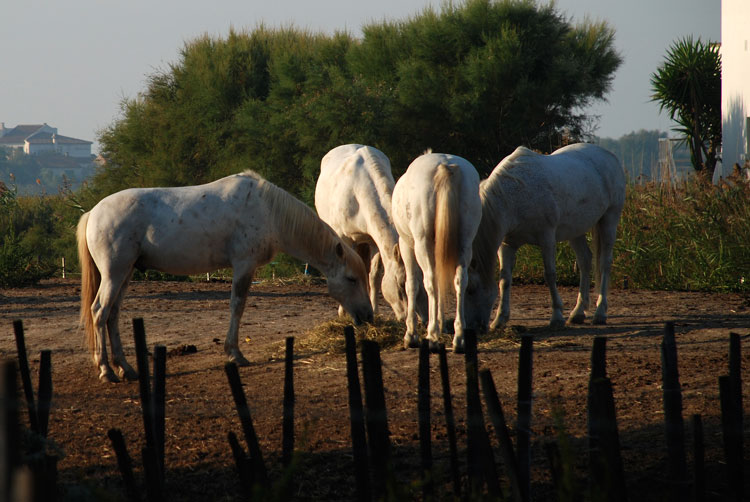 Ebenso wichtig sind die Pferde. Die gedrungenen, hellgrauen Pferde der Camargue sind eine eigene Rasse, die bereits in der Antike erwähnt wurden und eigentlich immer als Lasttiere und Schlachtrösser eingesetzt wurden. Schon früh wurden sie auch von den Hütern der Herden in der Camargue eingesetzt. Das ist auch heute noch der Fall. Vor allem beim Hüten der Stierherden sind sie unerläßlich. Heute spielen sie jedoch auch eine wichtige Rolle als Reitpferde für die Touristen und natürlich bei den diversen Festen und den Stierkämpfen. Und es gibt noch eine Besonderheit: Die Fohlen haben ein relativ dunkles, meist braunes Fell. Erst im Laufe der Entwicklung wird es dann weiß.