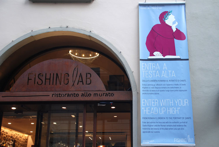 Völlig anders: Fishing Lab im Erdgeschoß und 1. Stock eines alten Palazzos direkt neben dem Bargello (Via del Proconsolo 16R). Modern, bei diesem Zwischending zwischen Bar, Bistro und Restaurant kommt man erst einmal auf die Idee "Systemgastronomie". (Dabei gibt es nur noch eine Filiale in Montecatini Terme). Aber das Konzept stimmt: (Fast) ausschließlich Fisch, keine große Küche, aber sehr gut zubereitet, originell serviert (Typ Streetfood), sehr gute Weißweine, alle auch glasweise und das zu einem anständigen (von Anstand) Preis. Dazu ein entspannter, lockerer Service. Eine sehr empfehlenswerte Adresse. Und mit einem Glas Vernaccia di San Gimignano in der Hand lohnt es sich die Freskenresten des Deckengewölbes im 1. Stock zu bestaunen - oder schaut Ihnen sonst Dante zuhause auf den Teller? Dort oben kann man im Übrigen auch sitzen.