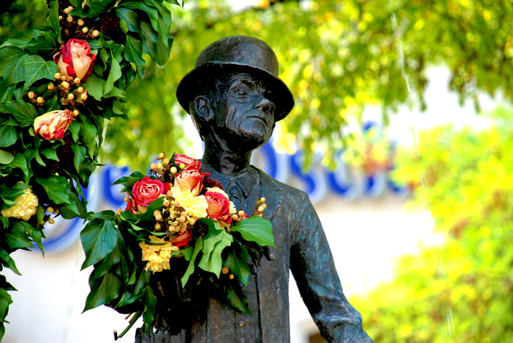 Bei all den frischen einheimischen und exotischen Lebensmitteln übersieht man ganz leicht, dass überall auf dem Markt kleinere und größere Brunnen mit den berühmtesten bayrischen Volksschauspielern stehen: Karl Valentin und Liesl Karlstadt, der Weiß-