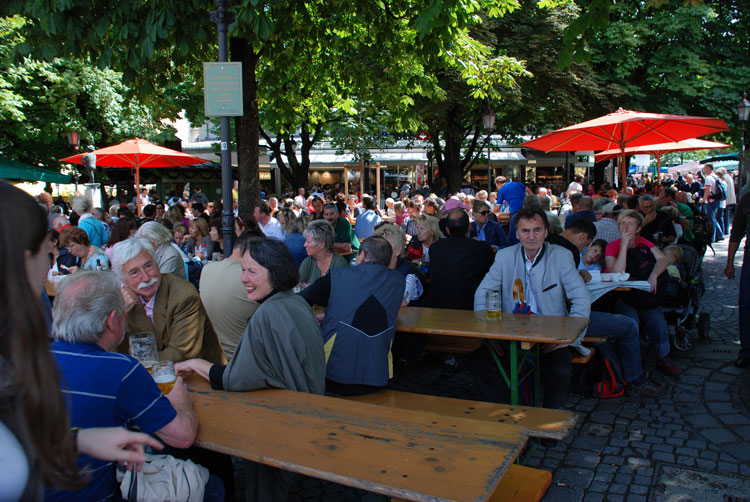 Das Schöne am Viktualienmarkt sind aber die vielen Möglichkeiten im Stehen oder Sitzen auch etwas zu trinken und zu essen: Schick oder rustikal, bayerisch oder international. Einkaufen und Freunde treffen und gemeinsam 2 Weißwürste mit Breze'n und Weißbier, 9 Nürnberger Rostbratwürste mit Kren* und einem Hellen aus dem Holzfass oder eine 1/2 Languste mit einem Glas Chablis - es gibt für jeden etwas. Und jeder hat so seine Lieblingsstände. Bei uns sind dies natürlich "die Fisch-Witte" (mit dem schönen bayrischen Slogan: "If it swims - we have it!"); der Tölzer Kasladen, Uwe's Kartoffelstandl oder Freisingers saure Delikatessen und seine frischen Kräuter. Sehr empfehlenswert, wenn auch vielleicht nicht für jeden:
