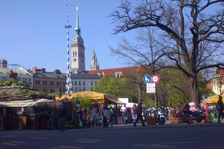 Der Viktualienmarkt ging aus dem Kreutlmarkt hervor, der 1807 ganz in der Nähe lag und ist heute nicht nur eine Touristenattraktion, sondern man kann dort wirklich gut (und nicht ganz billig) einkaufen. Obst und Gemüse sind die Schwerpunkte, es gibt aber auch Fisch, Fleisch, Brot,Wurst etc. - eben alle Victualien (lat. Lebensmittel).