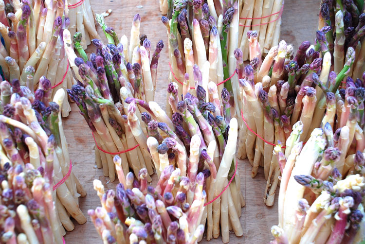 In Frankreich war daneben schon immer auch der violette Spargel beliebt, der geerntet wird, wenn die Spitzen durch die Erde kommen und etwas Licht abbekommen. In Ligurien gab es seit ca. 200 Jahren einen Spargel, der keine grüne, sondern eher eine violette Farbe aufwies. Diese Spezialität wurde  so gezüchtet, dass heute ein Spargel angeboten wird, der eine tiefpurpurne Farbe hat. Inzwischen wird er auch bei uns angebaut. Der Spargel- und Kartoffelhof Wenger beispielsweise hat ihn neben den traditionellen Sorten im Angebot. Er wächst, wenn auch in viel geringeren Mengen, sehr gut auf den sandigen, wasserdurchlässigen Böden um Schrobenhausen, eines der bekanntesten und besten Spargelanbaugebiete Deutschlands.
