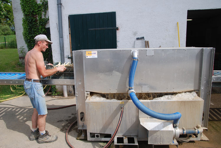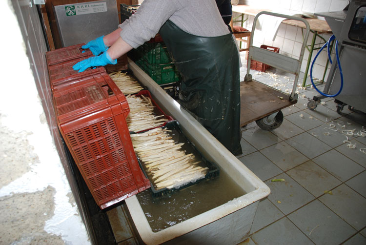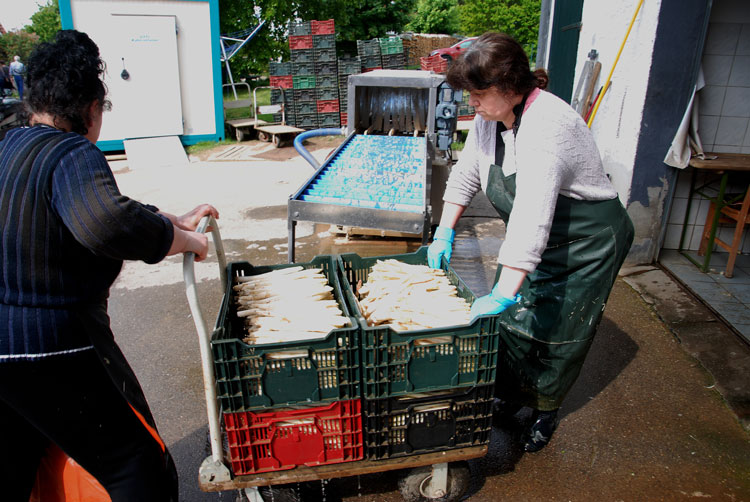Der Spargel- und Kartoffelhof Wenger in Schrobenhausen-Ried bietet in der Spargelzeit von Ende April bis Mitte Juni (der letzte Spargel wird traditionell an "Josephi", dem 26. Juni gestochen) übrigens auch Führungen an - sehr interessant und lehrreich. neben der Ernte, sieht man den frisch geernteten noch schmutzigen Spargel, die "Spargelwaschmaschine", das Schockbad, in dem der Spargel auf ca. 2° gekühlt wird, damit er frisch bleibt und seinen Geschmack behält, die Konfektionierung und die abschließende Lagerung im Kühlhaus. Und man kann natürlich wunderbar frischen Spargel vor Ort kaufen und ihn mit der Spargelschälmaschine auch gleich schälen lassen.