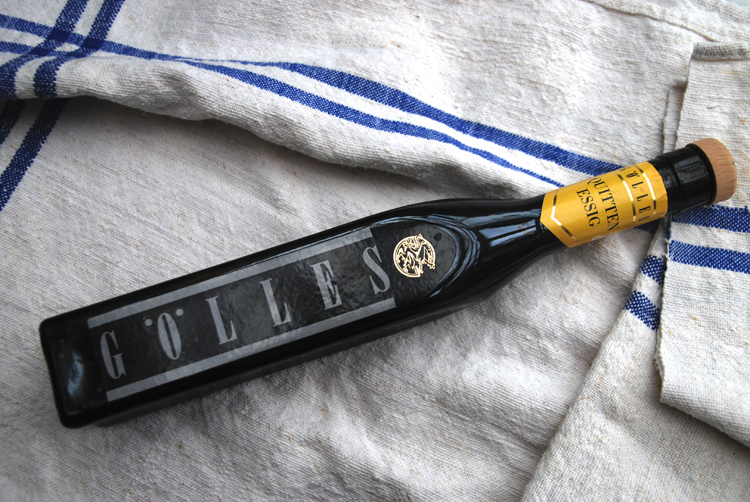 Sehr gute Frucht- und Obstessige produziert Alois Gölles in Riegersburg in der Steiermark und zwar sowohl solche, bei denen die Frische im Vordergrund steht (Edelstahlausbau), als auch solche, die im Holzfass ausgebaut werden. Wir lieben Weinessig aus Banyuls. Die Besonderheiten dieses Weins kommen bei einem 5-jährigen Essigausbau in Bonbonnes und im Barrique (z.T. im Freien)sehr gut zur Geltung und ergeben einen Essig, der sehr viel Aroma ohne spitze Säure hat und sich sowohl für Salatsaucen als auch die Aromatisierung anderer Gerichte (Fleisch, Fisch) eignet. Es gibt inzwischen jedoch eine Vielzahl von anderen Weinessigen, die entweder sortenrein aus bestimmten Rebsorten hergestellt werden (Spätburgunder; Sherry etc.) oder auch aus den Weinen bestimmter Weingebiete (Champagne; Jura; Weißer Burgunder etc.)