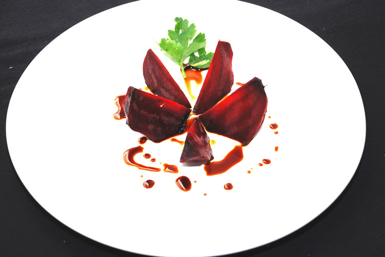 Will man rote Bete z.B. mit klein geschnittener Kalbsleber und glacierten Äpfeln servieren, kann man sie auch roh in kleinere Würfel oder Streifen schneiden, in etwas Butter weich dünsten, dann salzen, pfeffern und untermischen. Wenn sie beim Braten zu trocken werden, einige Tropfen Wasser zugeben.
