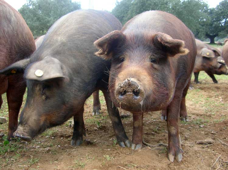 Iberico heißt die dunkel gefärbte Schweinerasse, die mehr oder weniger schwarz und behaart durch die Eichenwälder im Südwesten Spaniens zieht und sich von Wurzeln und Eicheln ernährt. Entsprechend behandelt ergeben sie nicht nur den besten, sondern auch den teuersten Schinken der Welt.