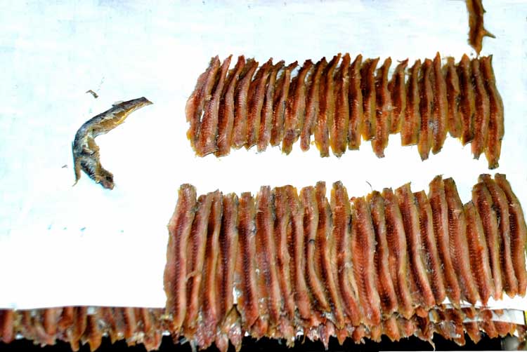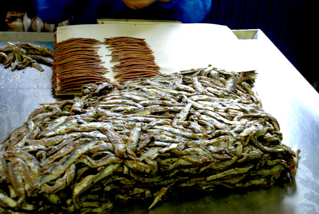 Sardellen im Salz (anchois au sel): Sie werden aus den Bottichen genommen, das Salz wird abgeklopft und sie werden so wie sie sind, also mit Mittelgräte in frische Lake aus 50% grobem Meersalz und 50% Wasser eingelegt. Vor Gebrauch muß man sie wässern und die Filets von der Gräte abziehen. Für uns die Königin der Anchovis: Aromatischer als die beiden anderen Zubereitungen und man kann sie mehr oder weniger lange wässern und so den Salzgeschmack regulieren. Sie sind um Klassen besser, als alles was man so bei uns bekommt.