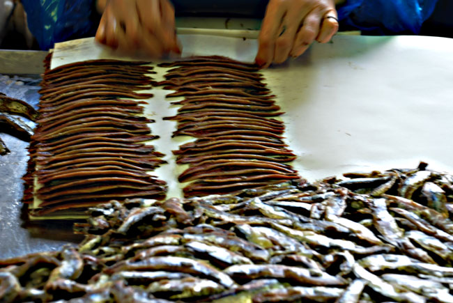 Sardellen in Öl (filets d'anchois): Die Sardellen werden mehrmals gewaschen, dann von Hand filettiert, auf saugfähiges Papier gelegt, um sie zu trocknen und dann in Gläser mit Sonnenblumenöl geschichtet. Der Vorteil ist, daß sie gebrauchsfertig sind. Dr Salzgeschmack ist dabei jedoch reativ stark und das Öl stört - obwohl es gut ist - je nach Zubereitung ebenfalls.