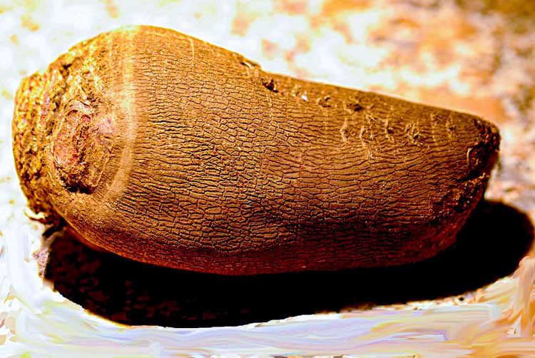 Sie verdankt ihren Namen ihrem Aussehen, insbesondere ihrer Haut. Sie ähnelt dabei eher einem Winterrettich, als den bei uns üblichen Knollen. Roh hat sie einen eher unangenehmen Geruch nach Zuckerrübe und schmeckt überhaupt nicht. Gegart in etwas Butter oder im Salzmantel strömt sie einen betörenden, intensiven Geruch nach Karotten aus und ist im Geschmack sehr voll und süß. Sowohl als Salat aber auch als Gemüse wunderbar.