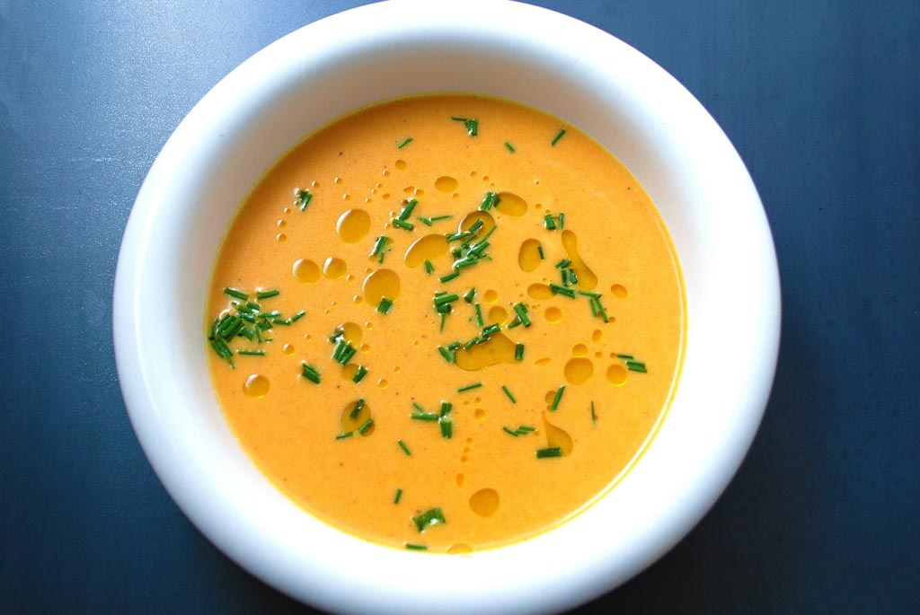 Eine provenzalische Variante der Kürbissuppe. Voraussetzung ist hier ein besonders gutes Olivenöl, da der Reiz des Gerichts in den verschiedenen Geschmackskomponenten von Kürbis, Schnittlauch und Öl liegt.