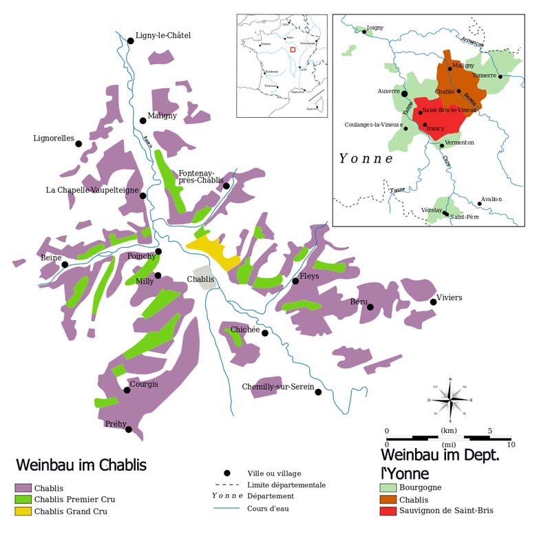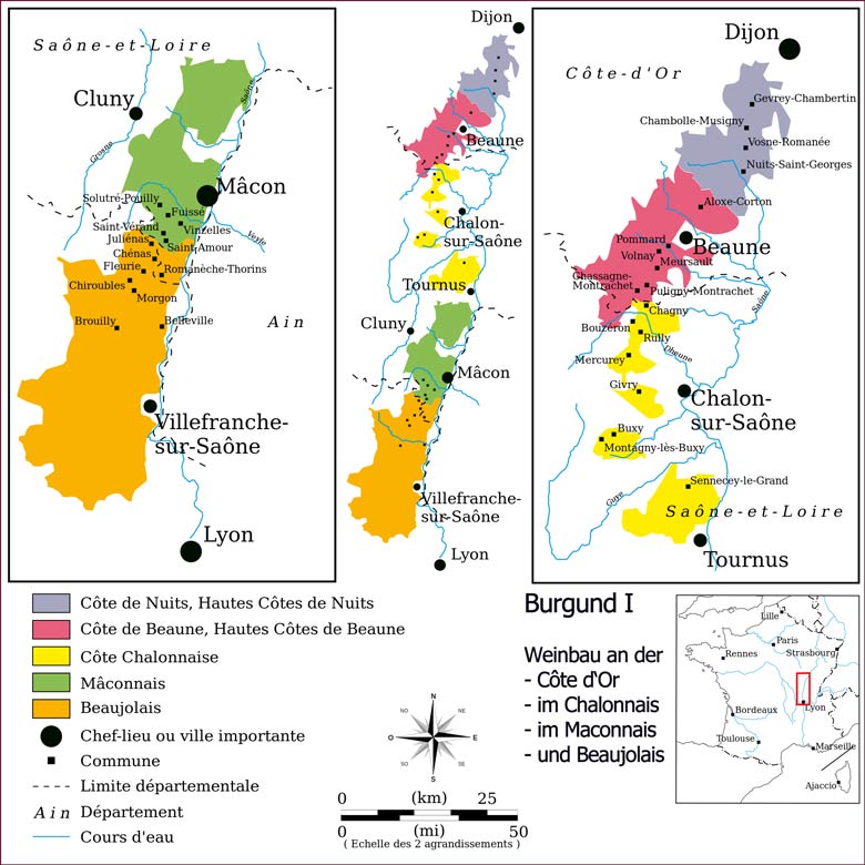 Es beginnt im Norden in Chablis wo besonders mineralische Chardonnays wachsen. Auch ohne dort gewesen zu sein, erkennt man sehr schön auf der Karte, daß die Spitzenlagen (Grand Crus) nur im Kerngebiet anzutreffen sind und auch die 1er Crus nur in besonders begünstigten Lagen. Dann folgt die Côte d'Or  zwischen Dijon und Santenay, die das qualitative Kernstück bildet. Im nördlichen Teil um Nuits Saint Georges wachsen die großen Burgunder-Rotweine: Romanée Conti, Chambertin, Musigny, um nur einige zu nennen, so berühmt, daß sich die Gemeinden den berühmtesten ihrer Weinberge an den Gemeindenamen angehängt haben. Zum Teil winzige Parzellen (der Romanée Conti produziert jährlich nur rund 5-6000 Flaschen), aber ganz große Weine. Das gleiche gilt für die Weißweine der Côte de Beaune: In Puligny-Montrachet, in Chassagne oder in Meursault werden die besten Chardonnays produziert, feine rote Burgunder kommen z.b. aus Volnay oder Pommard.