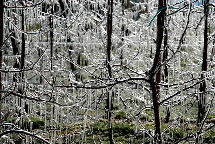 Und dies, obwohl es inzwischen eine Vielzahl von Schutzmaßnahmen gibt: Von den traditionellen, relativ günstigen Wärme- und Rauchfeuern in den Weinbergen bis zum High-Tech-Beregnungsverfahren, das die jungen Triebe mit einem schützenden Eisfilm überzieht. Mancherorts hat das sicher geholfen, aber es wird berichtet, dass insbesondere aus Südtirol; von der Loire, der Champagne und aus Bordeaux schwere Schäden gemeldet werden. Bordeaux hat bereits um Hilfen aus Brüssel angefragt.. Wie immer kann der volle Schaden erst in einigen Wochen festgestellt werden, wenn man sieht, ob und wie die geschädigten Reben wieder austreiben. Derzeit muss man jedoch davon ausgehen, dass es erhebliche Ernteinbußen geben wird.