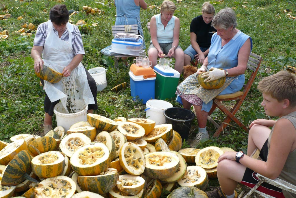 Steirischer Ölkürbis Die Kerne des steirischen Ölkürbis haben keine Schale und können deshalb ohne großen Aufwand gepresst werden. Sie werden dafür meist direkt auf den Feldern aufgeschnitten, die Kerne entfernt und das Fruchtfleisch und die Schalen bleiben auf den Feldern liegen. Vor dem Pressen werden die Kerne geröstet. Daher rührt auch die tiefdunkelgrüne Farbe für das "steirische Gold".
