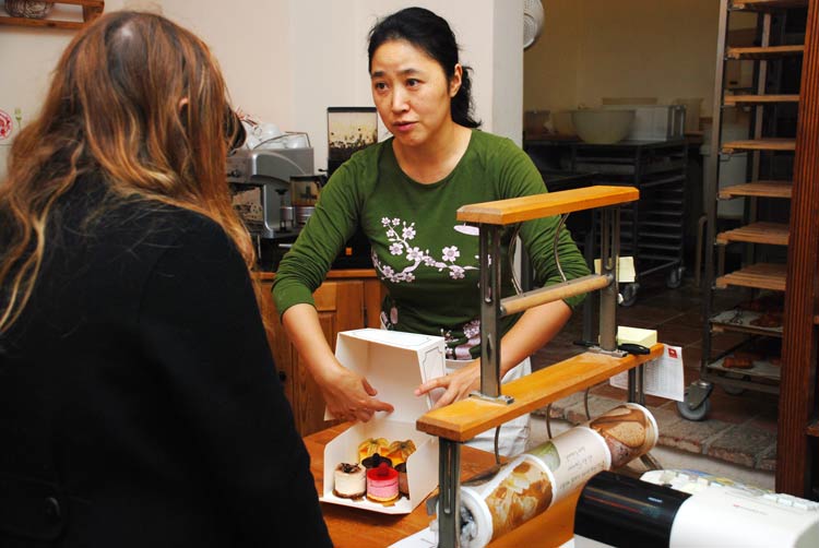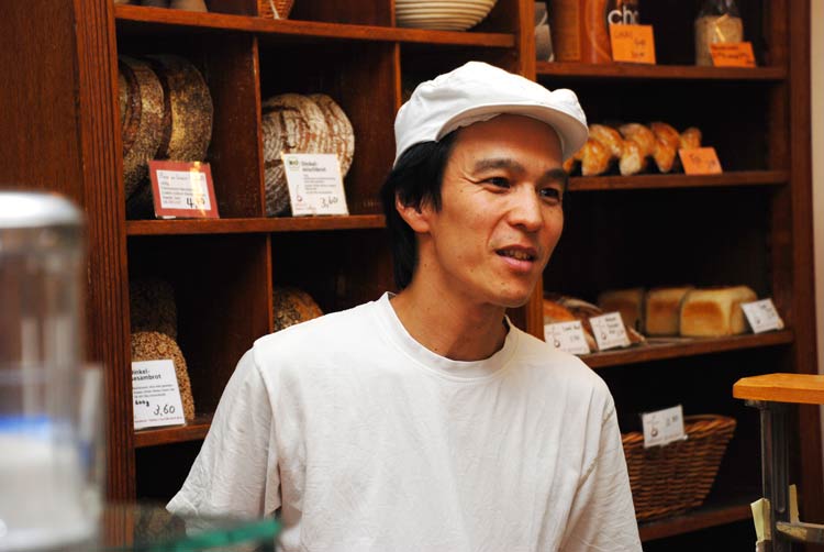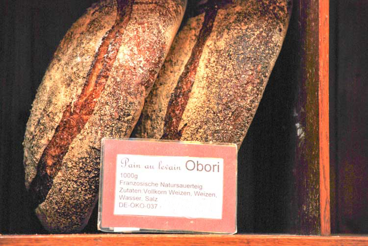 Aber nicht irgendeiner von den vielen Discount-Bäckern, sondern ein kleiner, feiner Laden in München-Haidhausen, wo Bäckermeister Michitoshi jeden Tag seine Teige frisch zubereitet: Für die dunklen (Vollkorn-)Brotsorten mit Mehl aus Bio-Anbau, für die französischen Weißbrotsorten mit Spitzen-Weißmehl aus Frankreich - alles ohne fremde Zusätze. Und Michitoshi macht auch - in Deutschland nicht so häufig zu finden - eine sehr gute, typisch provenzialische Fougasse. Seine Ehefrau Hinako ist Konditormeisterin und zeichnet für das hervorragende, ebenfalls französich beeinflusste, Sortiment an Kuchen und Gebäck verantwortlich.