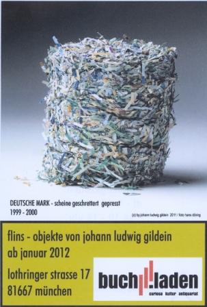 Kaum waren die vorweihnachtlichen Veranstaltungen vorbei, schon kam eine neue. Wieder im buch.laden, aber ohne uns. Dafür mit dem Künstler Johann Ludwig Gildein. er präsentiert Objekte aus der Serie "Flins" - z.B. Euro-Scheine geschreddert, Rapsöl, Formalin im Vorratsglas.