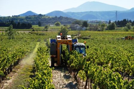 Die ungleichmäßige Reife bei den Grenachetrauben brachte sehr schnell auch wieder die Diskussion auf die Vollernter, da die Maschine im Gegensatz zu guten Trupps bei der manuellen Lese keine Unterschiede zwischen gutem und schlechtem Lesegut treffen kann. Es zeigte sich, daß die ordentlich arbeitenden Weingüter vor dem Einsatz des Vollernters, alle schlechten Trauben manuell herausgeschnitten hatten. Wenn man aber den Einsatz des Vollernters beobachtet wird es einem angst und bang um die Rebstöcke. Oder wie Frédéric Alary von der Domaine de l'Oratoire es formulierte: "Wer seinen Weinberg nicht liebt, der erntet maschinell". Es gibt aber noch 3 weitere Probleme: Der Ernter nimmt eine Vielzahl von Blättern und Zweigen, die den Most verunreinigen, wenn sie nicht vorher entfernt werden (was praktisch nicht möglich ist. Außerdem verdichten die mehrere Tonnen schweren Maschinen den Boden was für Wachstum und Gesundheit der Rebstöcke nachteilige Folgen hat- und wehe es regnet während der Ernte! Bei unserem Besuch hatte es am Nachmittag in der Ebene von Cairanne mehr als 30°. Dies führt zu einem weiteren problem: die brachiale Ertemethode führt dazu, daß ein Teil der Trauben gequetsch wird und der Saft bereit in der Erntemaschine herausläuft. Bis zum Umladen auf den Transportwagen und auf dem Transport in den Keller vergeht einige Zeit, so daß die Gärung hier schon unkontrolliert einsetzen kann. Zum Vergleich: Spitzengüter erten in kleine Körbe von 10 kg! Aber alles hat seinen Preis.