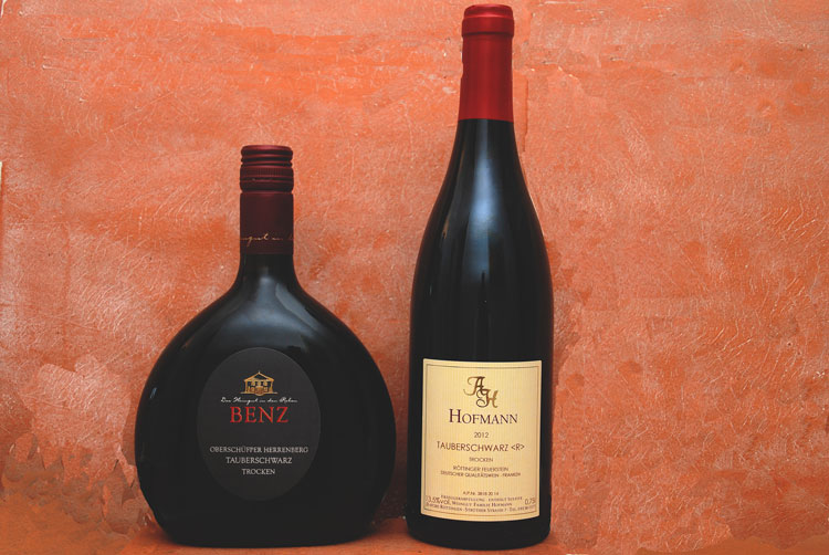 Bei konventionellem An- und Ausbau ergibt die Rebsorte eher helle Rotweine. Wird jedoch der Ertrag beschränkt ergeben sich zumindest in guten Jahren relativ dichte, dunkle Weine mit Struktur und einem zartbitteren Abgang. Der Ausbau in kleinen Holzfässern über 1-2 Jahre tut solchen Weinen schmeckbar gut. Ein Röttinger Feuerstein 2012 Tauberschwarz "R" vom Weingut Jürgen Hofmann beispielsweise, kann es mit vielen anderen Rotweinen aufnehmen.